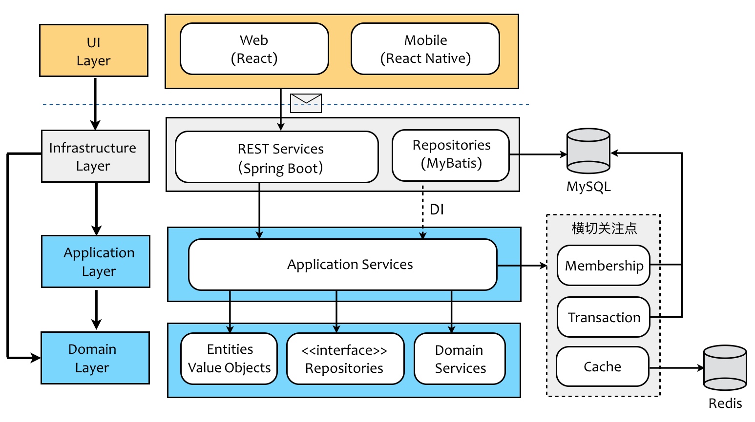 • 后端微服务使用领域模型驱动开发模式